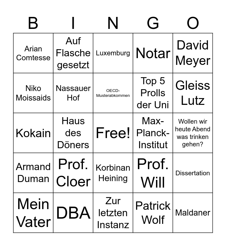 This bingo card has a free space and 24 words: Prof. Cloer, DBA, OECD-Musterabkommen, Mein Vater, David Meyer, Arian Comtesse, Niko Moissaids, Auf Flasche gesetzt, Max-Planck-Institut, Korbinan Heining, Top 5 Prolls der Uni, Kokain, Prof. Will, Dissertation, Nassauer Hof, Patrick Wolf, Wollen wir heute Abend was trinken gehen?, Luxemburg, Gleiss Lutz, Haus des Döners, Maldaner, Armand Duman, Notar and Zur letzten Instanz.