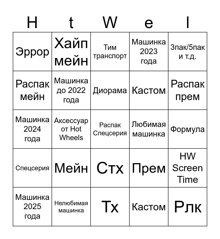 This bingo card has 25 words: Мейн, Тх, Диорама, Машинка 2025 года, 3пак/5пак и т.д., Эррор, Распак мейн, Хайп мейн, Любимая машинка, Стх, Кастом, Машинка 2024 года, Прем, HW Screen Time, Машинка до 2022 года, Рлк, Формула, Тим транспорт, Распак прем, Аксессуар от Hot Wheels, Распак Спецсерия, Нелюбимая машинка, Спецсерия, Машинка 2023 года and Кастом.