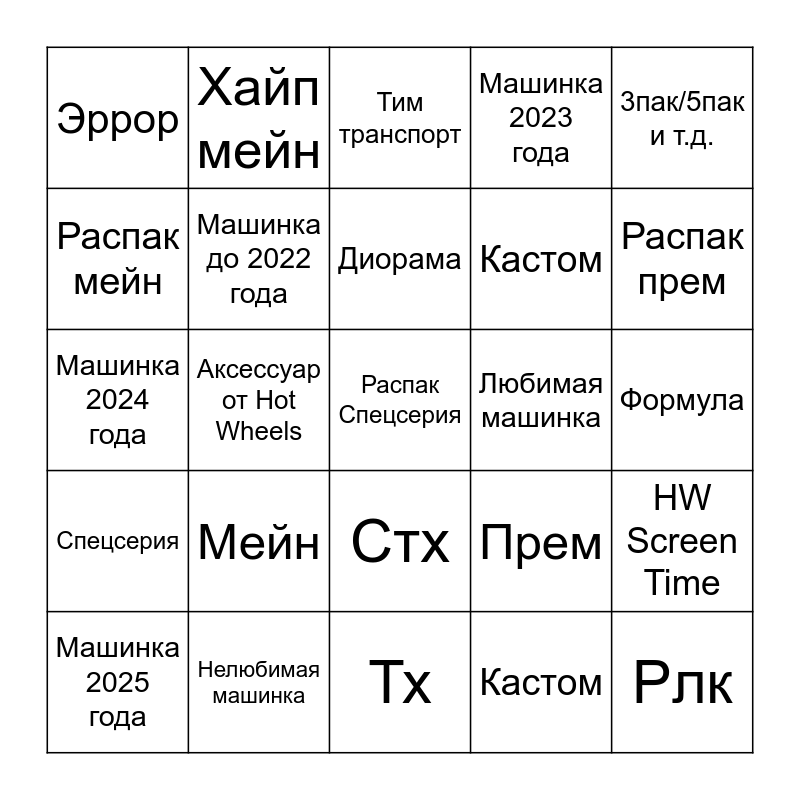 This bingo card has 25 words: Мейн, Тх, Диорама, Машинка 2025 года, 3пак/5пак и т.д., Эррор, Распак мейн, Хайп мейн, Любимая машинка, Стх, Кастом, Машинка 2024 года, Прем, HW Screen Time, Машинка до 2022 года, Рлк, Формула, Тим транспорт, Распак прем, Аксессуар от Hot Wheels, Распак Спецсерия, Нелюбимая машинка, Спецсерия, Машинка 2023 года and Кастом.