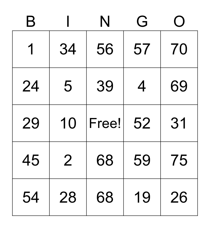 This bingo card has a free space and 24 words: 2, 28, 39, 54, 70, 1, 24, 34, 52, 68, 4, 29, 59, 75, 5, 19, 31, 56, 69, 10, 26, 45, 57 and 68.