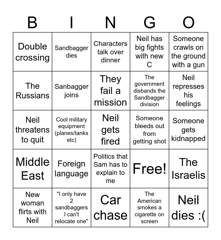This bingo card has 25 words: Foreign language, Car chase, They fail a mission, New woman flirts with Neil, Someone crawls on the ground with a gun, Double crossing, The Russians, Sandbagger dies, Someone bleeds out from getting shot, Politics that Sam has to explain to me, The government disbands the Sandbagger division, Neil threatens to quit, Free!, The Israelis, Sanbagger joins, Neil dies :(, Someone gets kidnapped, Characters talk over dinner, Neil represses his feelings, Cool military equipment (planes/tanks etc), Neil gets fired, "I only have 2 sandbaggers I can't relocate one", Middle East, Neil has big fights with new C and The American smokes a cigarette on screen.