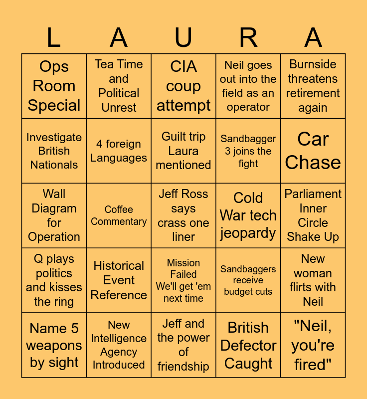 This bingo card has 25 words: Historical Event Reference, Jeff and the power of friendship, Guilt trip Laura mentioned, Name 5 weapons by sight, Burnside threatens retirement again, Ops Room Special, Investigate British Nationals, Tea Time and Political Unrest, Cold War tech jeopardy, Mission Failed We'll get 'em next time, Sandbagger 3 joins the fight, Wall Diagram for Operation, Sandbaggers receive budget cuts, New woman flirts with Neil, 4 foreign Languages, "Neil, you're fired", Parliament Inner Circle Shake Up, CIA coup attempt, Car Chase, Coffee Commentary, Jeff Ross says crass one liner, New Intelligence Agency Introduced, Q plays politics and kisses the ring, Neil goes out into the field as an operator and British Defector Caught.