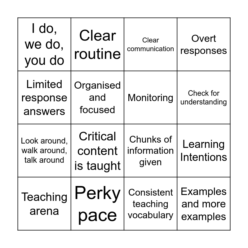 This bingo card has 20 words: Learning Intentions, Attention Cues, Clear communication, Engagement opportunity(inclusion), Teaching arena, Limited response answers, Perky pace, I do, we do, you do, Look around, walk around, talk around, Clear routine, Critical content is taught, Chunks of information given, Organised and focused, Examples and more examples, Monitoring, Feedback in a positive tone, Check for understanding, Overt responses, Consistent teaching vocabulary and Knowledge extension through existing knowledge.