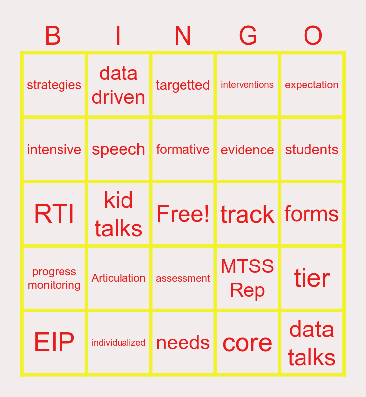 This bingo card has a free space and 28 words: tier, support, evidence, core, intensive, targetted, data driven, progress monitoring, track, EIP, RTI, interventions, individualized, needs, students, EES, Articulation, speech, formative, assessment, strategies, communication, data talks, kid talks, forms, MTSS Rep, expectation and small groups.