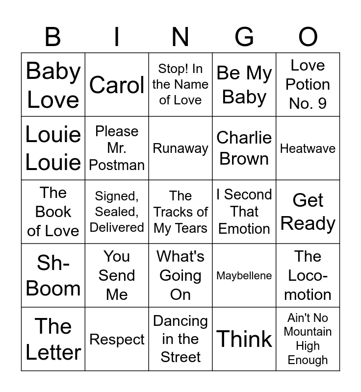 This bingo card has 30 words: Respect, My Girl, Signed, Sealed, Delivered, You Can't Hurry Love, Baby Love, Stop! In the Name of Love, Please Mr. Postman, What's Going On, I Second That Emotion, Dancing in the Street, Get Ready, The Tracks of My Tears, Think, Ain't No Mountain High Enough, Heatwave, Tutti-Frutti, Maybellene, Sh-Boom, You Send Me, Love Potion No. 9, The Book of Love, Tweedle Dee, Carol, Charlie Brown, Louie Louie, Be My Baby, The Loco-motion, The Letter, Runaway and Dance to the Music.