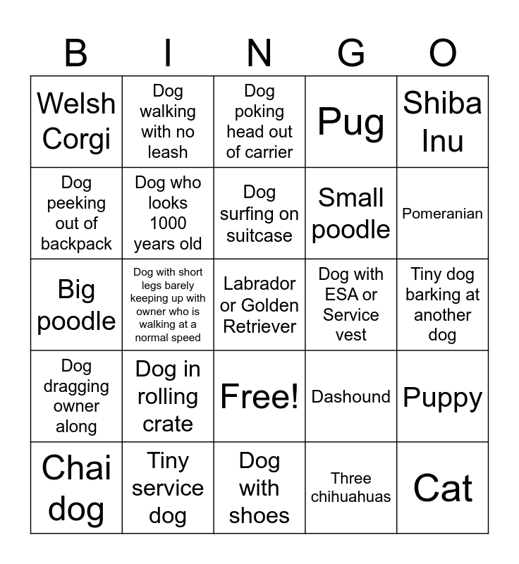 This bingo card has 26 words: Free!, Three chihuahuas, Dog surfing on suitcase, Tiny service dog, Shiba Inu, Welsh Corgi, Dog peeking out of backpack, Dog walking with no leash, Tiny dog barking at another dog, Dashound, Small poodle, Big poodle, Puppy, Chai dog, Dog with short legs barely keeping up with owner who is walking at a normal speed, French bulldog, Pug, Dog dragging owner along, Dog poking head out of carrier, Labrador or Golden Retriever, Pomeranian, Dog with shoes, Dog with ESA or Service vest, Dog in rolling crate, Dog who looks 1000 years old and Cat.