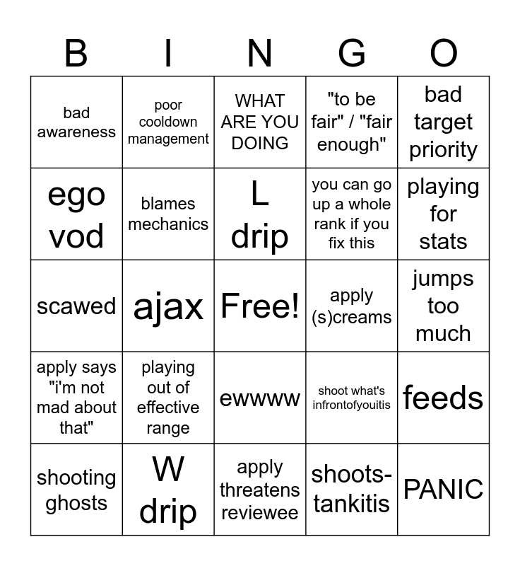 This bingo card has a free space and 24 words: playing out of effective range, W drip, L drip, shooting ghosts, bad target priority, bad awareness, ego vod, poor cooldown management, apply (s)creams, ewwww, you can go up a whole rank if you fix this, scawed, shoot what's infrontofyouitis, feeds, blames mechanics, shoots-tankitis, jumps too much, WHAT ARE YOU DOING, playing for stats, ajax, PANIC, apply says "i'm not mad about that", "to be fair" / "fair enough" and apply threatens reviewee.