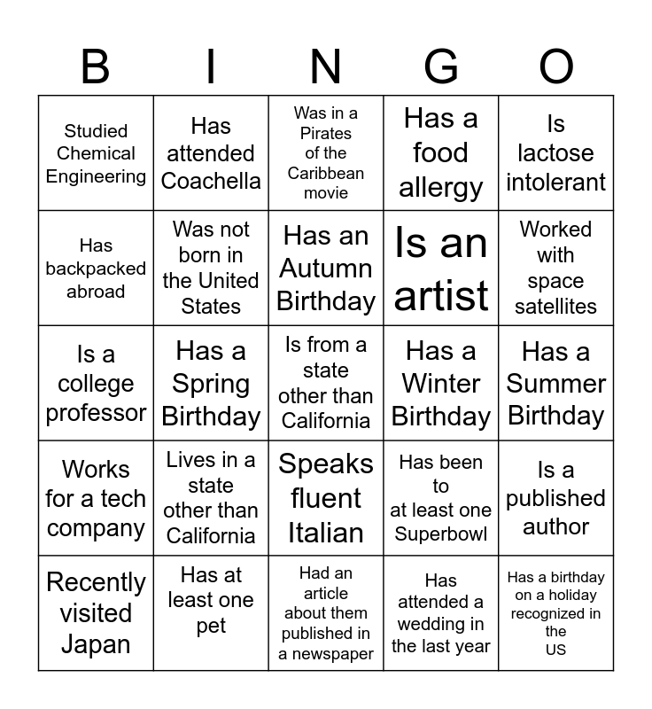 This bingo card has a free space and 24 words: Lives in a state other than California, Has at least one pet, Has an Autumn Birthday, Recently visited Japan, Is lactose intolerant, Studied Chemical Engineering, Has backpacked abroad, Has attended Coachella, Has a Winter Birthday, Speaks fluent Italian, Is an artist, Is a college professor, Has been to at least one Superbowl, Is a published author, Was not born in the United States, Has attended a wedding in the last year, Has a Summer Birthday, Was in a Pirates of the Caribbean movie, Worked with space satellites, Has a Spring Birthday, Has a birthday on a holiday recognized in the US, Works for a tech company, Has a food allergy and Had an article about them published in a newspaper.