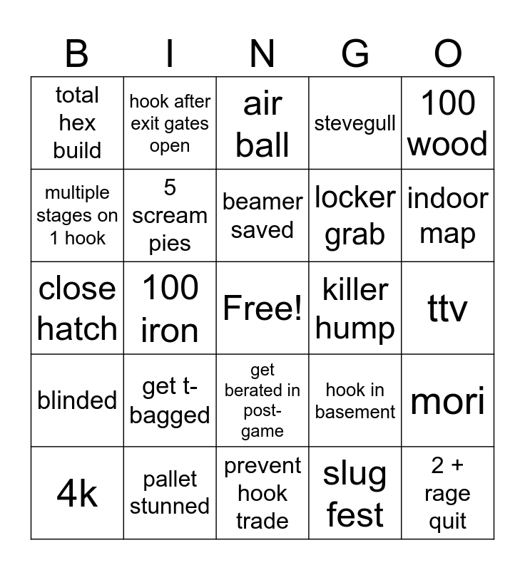 This bingo card has a free space and 24 words: get t-bagged, pallet stunned, beamer saved, 4k, 100 wood, total hex build, multiple stages on 1 hook, hook after exit gates open, killer hump, get berated in post-game, locker grab, close hatch, hook in basement, mori, 5 scream pies, slug fest, ttv, air ball, indoor map, 100 iron, 2 + rage quit, blinded, stevegull and prevent hook trade.