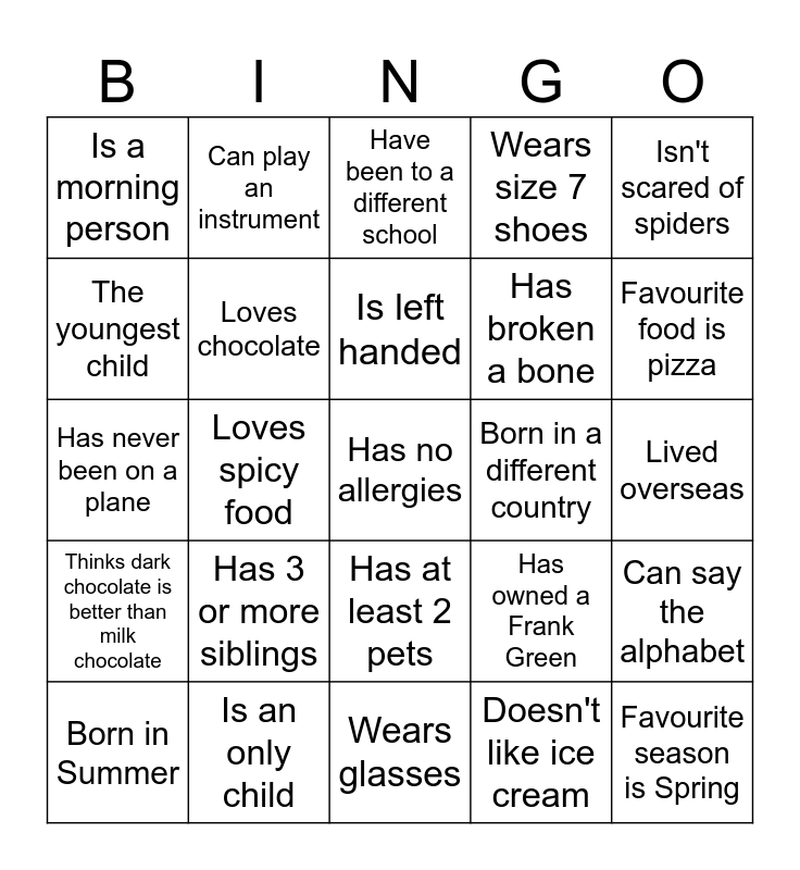 This bingo card has a free space and 24 words: Has 3 or more siblings, Is an only child, Is left handed, Born in Summer, Isn't scared of spiders, Is a morning person, The youngest child, Can play an instrument, Born in a different country, Has at least 2 pets, Has broken a bone, Has never been on a plane, Has owned a Frank Green, Can say the alphabet, Loves chocolate, Doesn't like ice cream, Lived overseas, Have been to a different school, Favourite food is pizza, Loves spicy food, Favourite season is Spring, Thinks dark chocolate is better than milk chocolate, Wears size 7 shoes and Wears glasses.