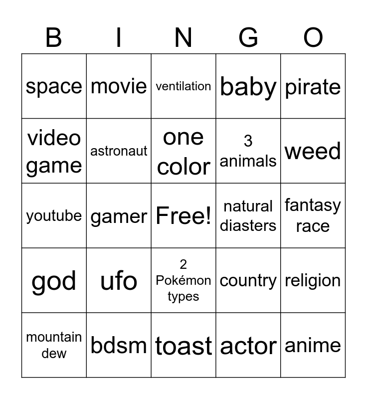 This bingo card has a free space and 24 words: ufo, bdsm, one color, mountain dew, pirate, space, video game, movie, natural diasters, 2 Pokémon types, 3 animals, youtube, country, religion, astronaut, actor, fantasy race, ventilation, weed, gamer, anime, god, baby and toast.