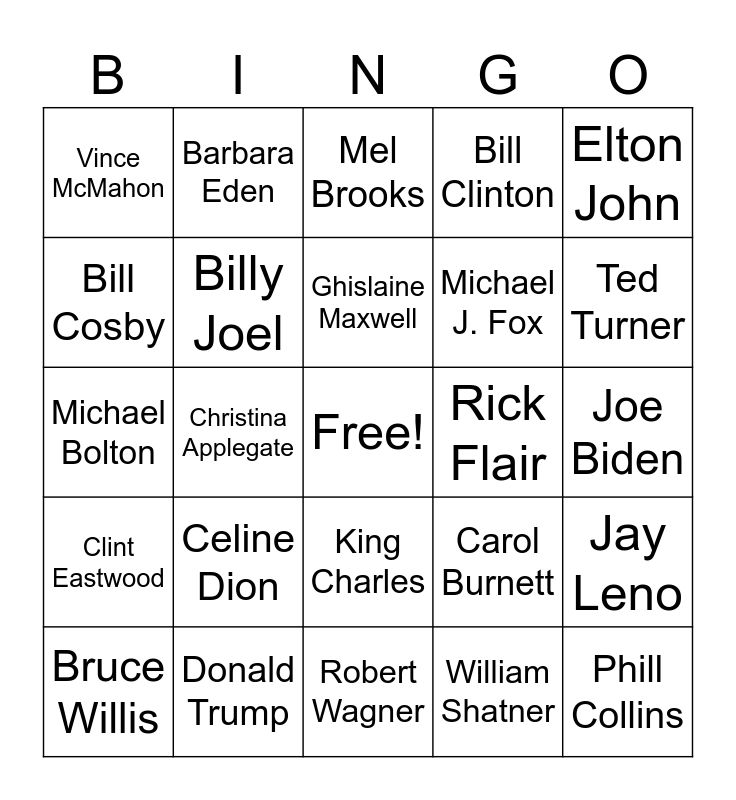 This bingo card has a free space and 24 words: Bruce Willis, Celine Dion, Ghislaine Maxwell, William Shatner, Elton John, Vince McMahon, Barbara Eden, Mel Brooks, Rick Flair, Joe Biden, Michael Bolton, Billy Joel, Carol Burnett, Jay Leno, Bill Cosby, Donald Trump, Robert Wagner, Bill Clinton, Ted Turner, Clint Eastwood, Christina Applegate, King Charles, Michael J. Fox and Phill Collins.