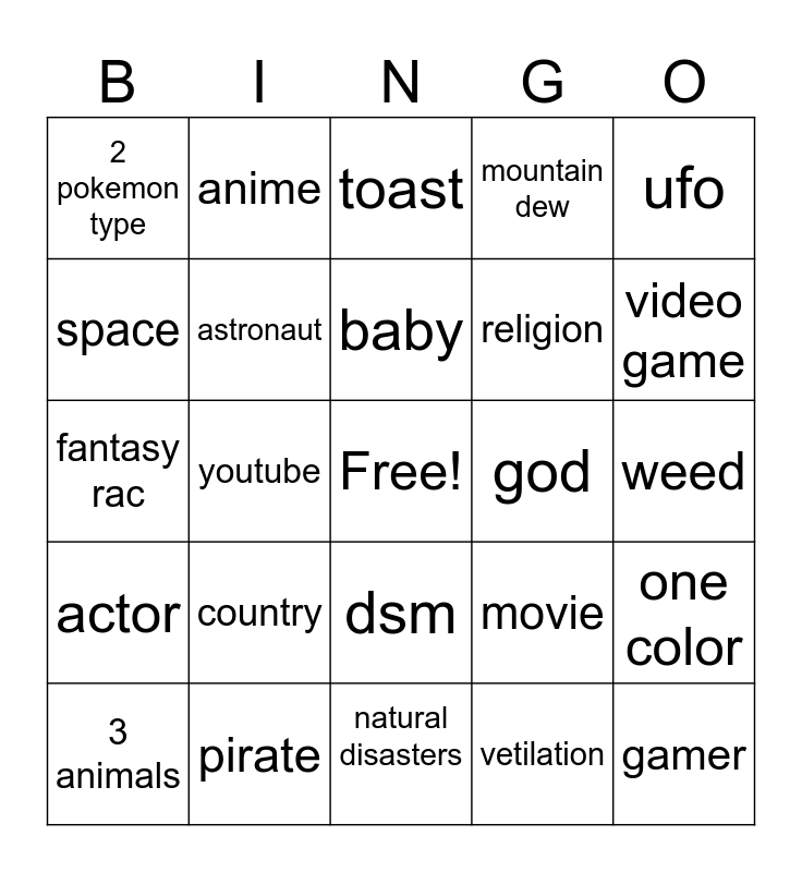 This bingo card has a free space and 24 words: country, pirate, baby, 3 animals, ufo, 2 pokemon type, space, anime, god, dsm, religion, fantasy rac, movie, one color, astronaut, vetilation, weed, toast, video game, youtube, gamer, actor, mountain dew and natural disasters.