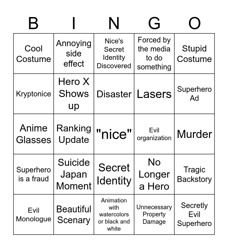 This bingo card has a free space and 24 words: Suicide Japan Moment, Beautiful Scenary, Disaster, Evil Monologue, Stupid Costume, Cool Costume, Kryptonice, Annoying side effect, Evil organization, Secret Identity, Lasers, Anime Glasses, No Longer a Hero, Tragic Backstory, Hero X Shows up, Unnecessary Property Damage, Murder, Nice's Secret Identity Discovered, Superhero Ad, Ranking Update, Secretly Evil Superhero, Superhero is a fraud, Forced by the media to do something and Animation with watercolors or black and white.