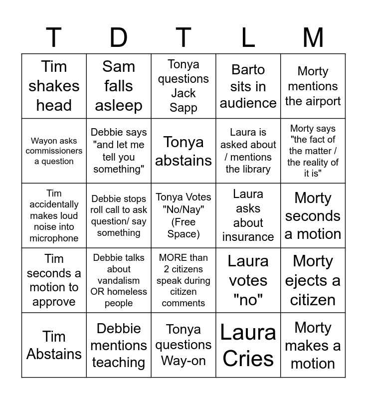 This bingo card has a free space and 29 words: Tim talks about AJ, Debbie mentions teaching, Tonya questions Jack Sapp, Laura Raises Glasses, Morty mentions the airport, Tim shakes head, Debbie says "and let me tell you something", Tonya abstains, Laura asks about insurance, Morty ejects a citizen, Tim Abstains, Debbie stops roll call to ask question/ say something, Laura Cries, Morty makes a motion, Tim accidentally makes loud noise into microphone, Debbie makes a motion to approve, Tonya questions Way-on, Laura votes "no", Morty says "the fact of the matter / the reality of it is", Tim seconds a motion to approve, Debbie talks about vandalism OR homeless people, Tonya makes a motion to approve, Laura is asked about / mentions the library, Morty seconds a motion, Wayon asks commissioners a question, Sam falls asleep, MORE than 2 citizens speak during citizen comments, Barto sits in audience and Billy slouches in chair.