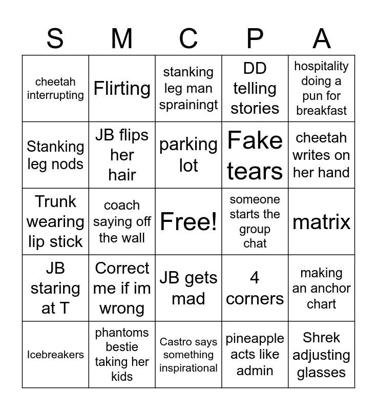 This bingo card has a free space and 24 words: Correct me if im wrong, phantoms bestie taking her kids, parking lot, Icebreakers, hospitality doing a pun for breakfast, cheetah interrupting, Stanking leg nods, Flirting, someone starts the group chat, JB gets mad, Fake tears, Trunk wearing lip stick, 4 corners, making an anchor chart, JB flips her hair, pineapple acts like admin, matrix, stanking leg man sprainingt, cheetah writes on her hand, coach saying off the wall, Shrek adjusting glasses, JB staring at T, DD telling stories and Castro says something inspirational.