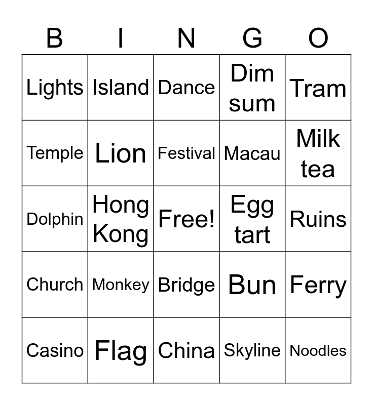 This bingo card has a free space and 24 words: Monkey, Flag, Festival, Casino, Tram, Lights, Temple, Island, Egg tart, Bridge, Macau, Dolphin, Bun, Ferry, Lion, Skyline, Ruins, Dance, Milk tea, Hong Kong, Noodles, Church, Dim sum and China.