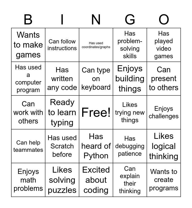 This bingo card has a free space and 24 words: Has used Scratch before, Likes solving puzzles, Can type on keyboard, Enjoys math problems, Has played video games, Wants to make games, Has used a computer program, Can follow instructions, Likes trying new things, Has heard of Python, Enjoys building things, Can work with others, Has debugging patience, Likes logical thinking, Has written any code, Can explain their thinking, Enjoys challenges, Has used coordinates/graphs, Can present to others, Ready to learn typing, Wants to create programs, Can help teammates, Has problem-solving skills and Excited about coding.