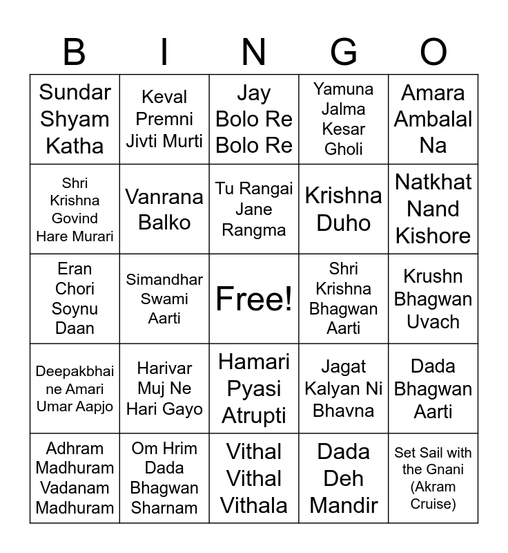 This bingo card has a free space and 32 words: Dada Deh Mandir, Gnani Bal mate Halardu, Simandhar Swami Aarti, Dada Dur Chhata Pase Lage Chhe, Deepakbhai ne Amari Umar Aapjo, Vanrana Balko, Amara Ambalal Na, Dada Bhagwan Aarti, Keval Premni Jivti Murti, Tara Darshanna Diwana, Tu Rangai Jane Rangma, Jay Bolo Re Bolo Re, Shiv Bhagwan Aarti, Aankhoma Vasi Gayu Chhe, Shri Krishna Bhagwan Aarti, Krishna Bhagwan Aarti Kaviraj, Adhram Madhuram Vadanam Madhuram, Eran Chori Soynu Daan, Hamari Pyasi Atrupti, Harivar Muj Ne Hari Gayo, Jagat Kalyan Ni Bhavna, Kanudo Bansi Chhede Re, Krushn Bhagwan Uvach, Om Hrim Dada Bhagwan Sharnam, Set Sail with the Gnani (Akram Cruise), Yamuna Jalma Kesar Gholi, Krishna Duho, Shri Krishna Govind Hare Murari, Sundar Shyam Katha, Vithal Vithal Vithala, He Ranglo Jamyo and Natkhat Nand Kishore.