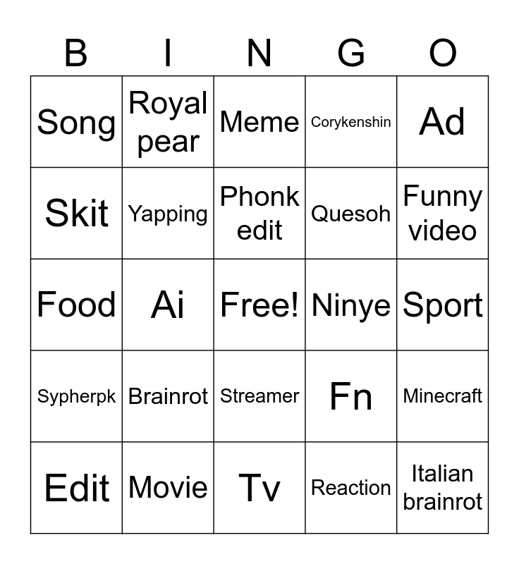This bingo card has a free space and 24 words: Brainrot, Movie, Phonk edit, Edit, Ad, Song, Skit, Royal pear, Ninye, Streamer, Quesoh, Food, Fn, Minecraft, Yapping, Reaction, Sport, Meme, Funny video, Ai, Italian brainrot, Sypherpk, Corykenshin and Tv.