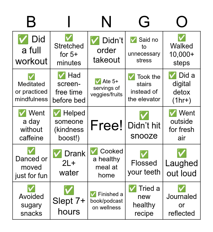 This bingo card has a free space and 24 words: ✅ Drank 2L+ water, ✅ Slept 7+ hours, ✅ Ate 5+ servings of veggies/fruits, ✅ Avoided sugary snacks, ✅ Walked 10,000+ steps, ✅ Did a full workout, ✅ Meditated or practiced mindfulness, ✅ Stretched for 5+ minutes, ✅ Didn’t hit snooze, ✅ Cooked a healthy meal at home, ✅ Took the stairs instead of the elevator, ✅ Went a day without caffeine, ✅ Flossed your teeth, ✅ Laughed out loud, ✅ Had screen-free time before bed, ✅ Tried a new healthy recipe, ✅ Went outside for fresh air, ✅ Didn’t order takeout, ✅ Did a digital detox (1hr+), ✅ Helped someone (kindness boost!), ✅ Journaled or reflected, ✅ Danced or moved just for fun, ✅ Said no to unnecessary stress and ✅ Finished a book/podcast on wellness.