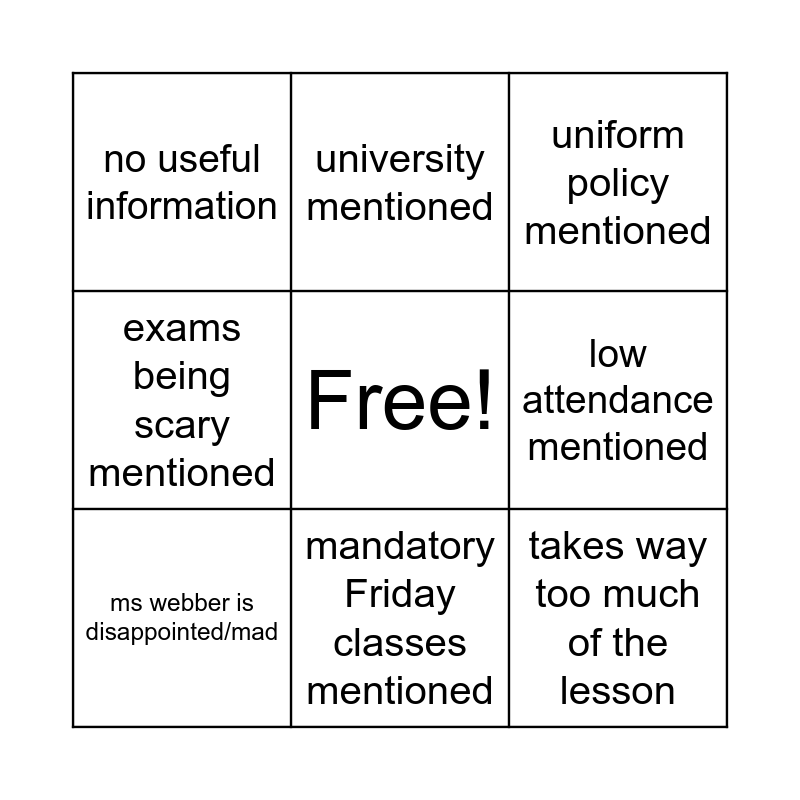 This bingo card has a free space and 9 words: ms webber is disappointed/mad, uniform policy mentioned, university mentioned, exams being scary mentioned, no useful information, low attendance mentioned, takes way too much of the lesson, bathroom policies mentioned and mandatory Friday classes mentioned.