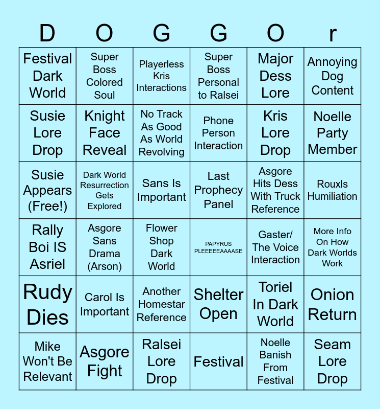 This bingo card has 36 words: Shelter Open, Another Homestar Reference, Festival, Susie Lore Drop, Rally Boi IS Asriel, Last Prophecy Panel, Knight Face Reveal, Ralsei Lore Drop, Major Dess Lore, Toriel In Dark World, Noelle Party Member, Super Boss Personal to Ralsei, Onion Return, Dark World Resurrection Gets Explored, Phone Person Interaction, Festival Dark World, Rudy Dies, Asgore Hits Dess With Truck Reference, Susie Appears (Free!), Playerless Kris Interactions, Sans Is Important, Asgore Sans Drama (Arson), PAPYRUS PLEEEEEAAAASE, Flower Shop Dark World, Gaster/ The Voice Interaction, Super Boss Colored Soul, Kris Lore Drop, Asgore Fight, No Track As Good As World Revolving, Annoying Dog Content, Seam Lore Drop, Mike Won't Be Relevant, More Info On How Dark Worlds Work, Rouxls Humiliation, Carol Is Important and Noelle Banish From Festival.