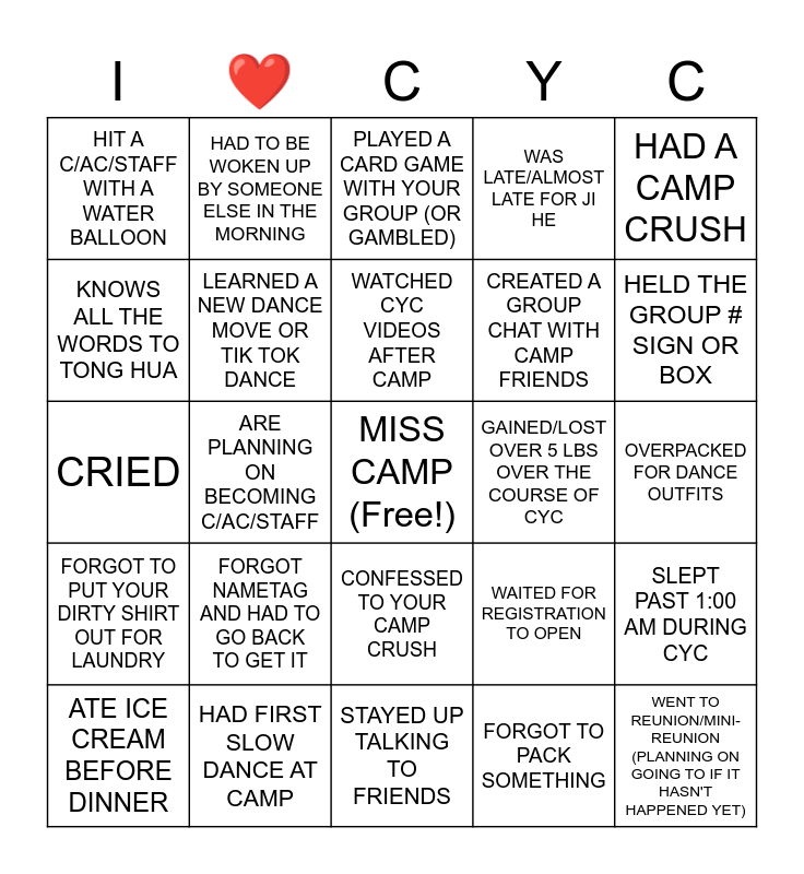 This bingo card has a free space and 24 words: FORGOT NAMETAG AND HAD TO GO BACK TO GET IT, HAD FIRST SLOW DANCE AT CAMP, WATCHED CYC VIDEOS AFTER CAMP, ATE ICE CREAM BEFORE DINNER, HAD A CAMP CRUSH, HIT A C/AC/STAFF WITH A WATER BALLOON, KNOWS ALL THE WORDS TO TONG HUA, HAD TO BE WOKEN UP BY SOMEONE ELSE IN THE MORNING, GAINED/LOST OVER 5 LBS OVER THE COURSE OF CYC, CONFESSED TO YOUR CAMP CRUSH, CREATED A GROUP CHAT WITH CAMP FRIENDS, CRIED, WAITED FOR REGISTRATION TO OPEN, SLEPT PAST 1:00 AM DURING CYC, LEARNED A NEW DANCE MOVE OR TIK TOK DANCE, FORGOT TO PACK SOMETHING, OVERPACKED FOR DANCE OUTFITS, PLAYED A CARD GAME WITH YOUR GROUP (OR GAMBLED), HELD THE GROUP # SIGN OR BOX, ARE PLANNING ON BECOMING C/AC/STAFF, WENT TO REUNION/MINI-REUNION (PLANNING ON GOING TO IF IT HASN'T HAPPENED YET), FORGOT TO PUT YOUR DIRTY SHIRT OUT FOR LAUNDRY, WAS LATE/ALMOST LATE FOR JI HE and STAYED UP TALKING TO FRIENDS.