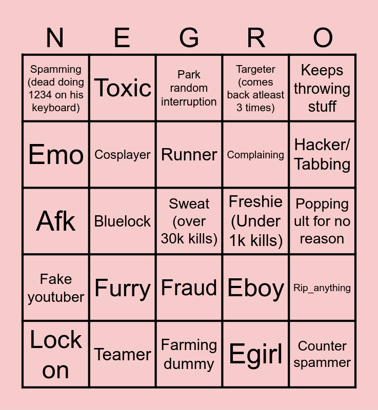 This bingo card has a free space and 24 words: Furry, Teamer, Runner, Lock on, Keeps throwing stuff, Spamming (dead doing 1234 on his keyboard), Emo, Toxic, Freshie (Under 1k kills), Fraud, Complaining, Afk, Eboy, Rip_anything, Cosplayer, Egirl, Popping ult for no reason, Park random interruption, Hacker/ Tabbing, Bluelock, Counter spammer, Fake youtuber, Targeter (comes back atleast 3 times) and Farming dummy.