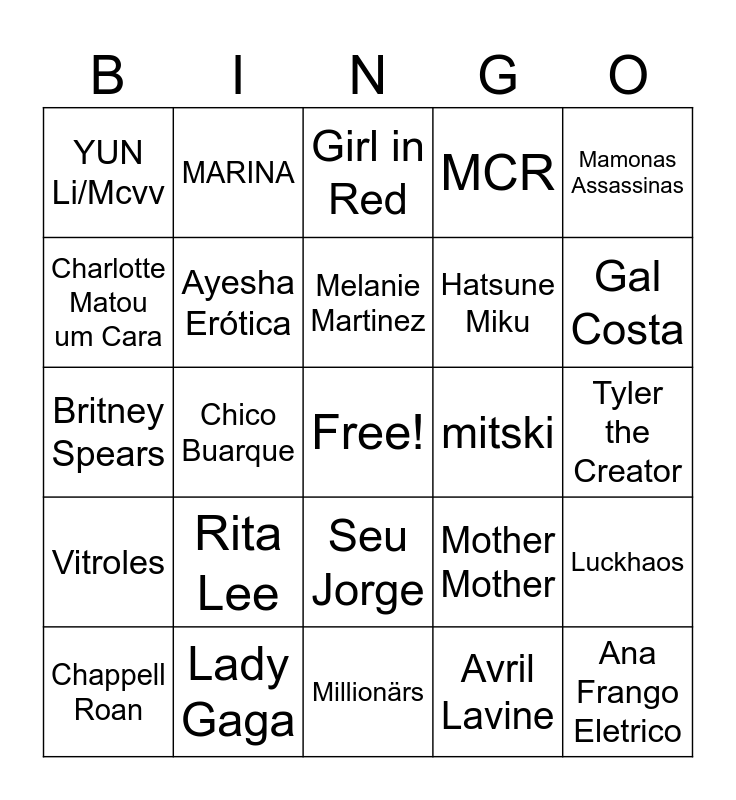 This bingo card has a free space and 24 words: Rita Lee, Lady Gaga, Melanie Martinez, Chappell Roan, Mamonas Assassinas, YUN Li/Mcvv, Charlotte Matou um Cara, MARINA, mitski, Seu Jorge, Hatsune Miku, Britney Spears, Mother Mother, Luckhaos, Ayesha Erótica, Avril Lavine, Tyler the Creator, Girl in Red, Gal Costa, Chico Buarque, Ana Frango Eletrico, Vitroles, MCR and Millionärs.