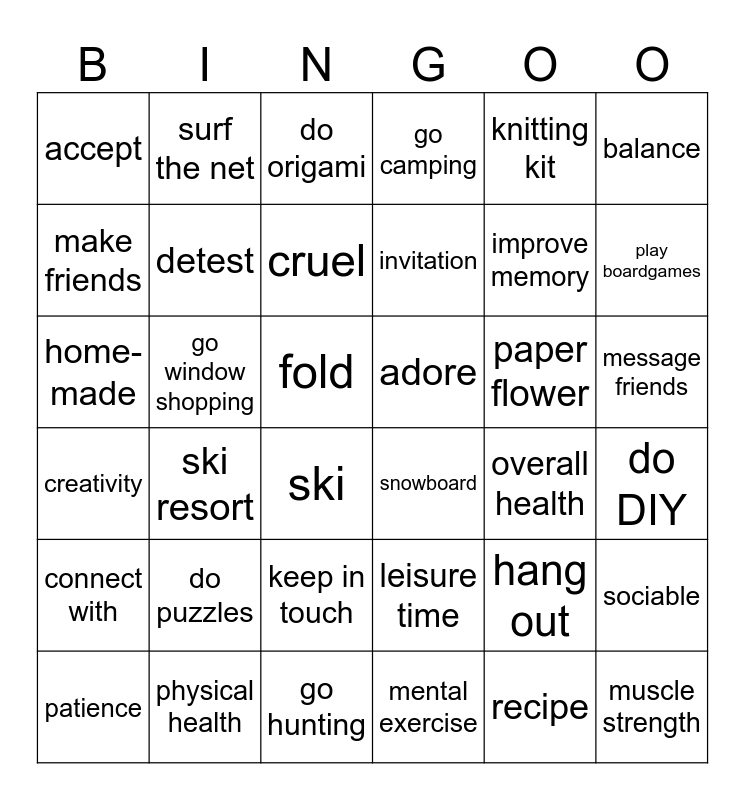 This bingo card has 36 words: leisure time, keep in touch, mental exercise, make friends, creativity, adore, detest, go hunting, knitting kit, hang out, play boardgames, go camping, sociable, go window shopping, invitation, accept, connect with, paper flower, home-made, do origami, fold, ski resort, snowboard, ski, overall health, surf the net, improve memory, physical health, cruel, balance, muscle strength, patience, do DIY, message friends, do puzzles and recipe.
