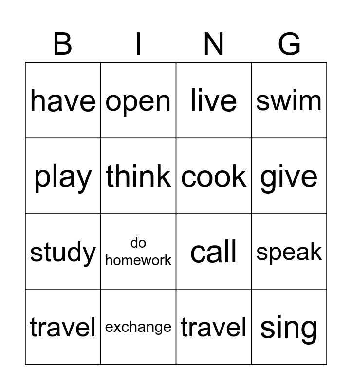 This bingo card has 40 words: arrive, call, take care of, cook, dance, drive, give, meet, play, sing, speak, swim, travel, travel, exchange, exercise, go, have, know, live, make, say, study, think, use, want, watch, work, get up, take, get, leave, start, listen, do homework, finish, read, sit down, open and ask.