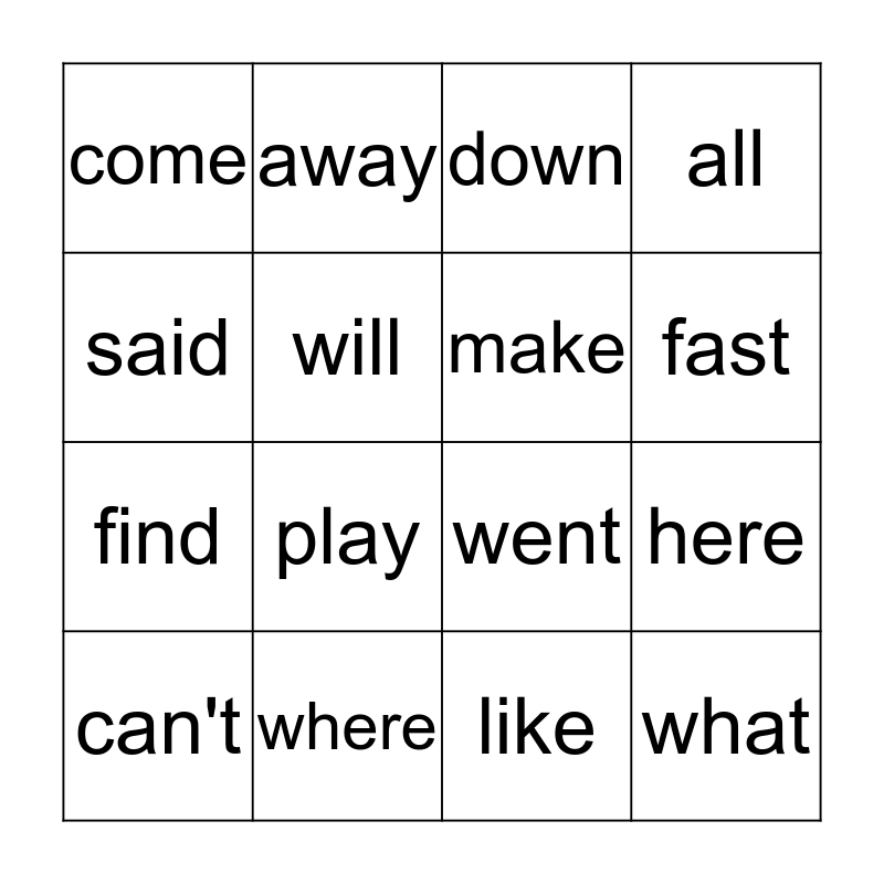 This bingo card has 16 words: where, here, down, come, find, away, went, like, said, will, can't, all, play, fast, make and what.
