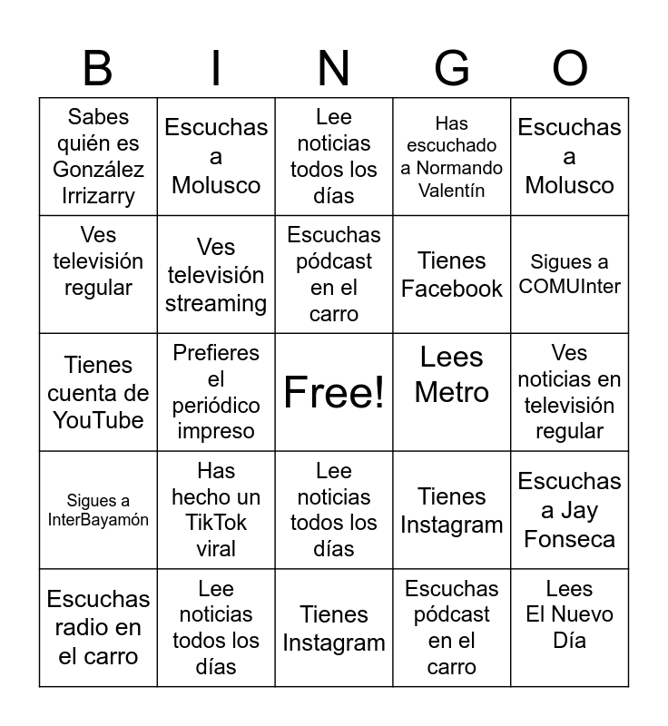 This bingo card has a free space and 24 words: Has hecho un TikTok viral, Lee noticias todos los días, Escuchas pódcast en el carro, Escuchas radio en el carro, Escuchas a Molusco, Sabes quién es González Irrizarry, Ves televisión regular, Escuchas a Molusco, Lees Metro, Lee noticias todos los días, Tienes Facebook, Tienes cuenta de YouTube, Tienes Instagram, Escuchas a Jay Fonseca, Ves televisión streaming, Escuchas pódcast en el carro, Ves noticias en televisión regular, Lee noticias todos los días, Sigues a COMUInter, Prefieres el periódico impreso, Lees El Nuevo Día, Sigues a InterBayamón, Has escuchado a Normando Valentín and Tienes Instagram.