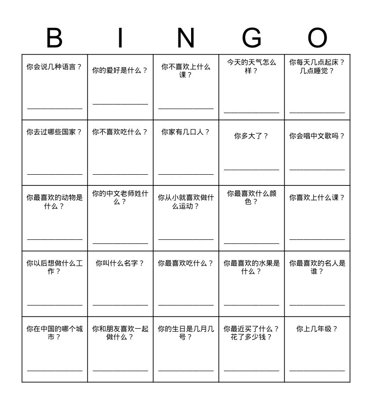 This bingo card has 25 words: 你叫什么名字? ————————, 你的生日是几月几号? ————————, 你家有几口人? ————————, 你在中国的哪个城市? ————————, 你每天几点起床?几点睡觉? ————————, 你会说几种语言? ————————, 你去过哪些国家? ————————, 你的爱好是什么? ————————, 你最喜欢什么颜色? ————————, 你最喜欢吃什么? ————————, 你多大了? ————————, 你最喜欢的动物是什么? ————————, 你最喜欢的水果是什么? ————————, 你最喜欢的名人是谁? ————————, 你不喜欢吃什么? ————————, 你上几年级? ————————, 你喜欢上什么课? ————————, 你不喜欢上什么课? ————————, 你会唱中文歌吗? ————————, 你的中文老师姓什么? ————————, 你从小就喜欢做什么运动? ————————, 你和朋友喜欢一起做什么? ————————, 你以后想做什么工作? ————————, 今天的天气怎么样? ———————— and 你最近买了什么?花了多少钱? ————————.