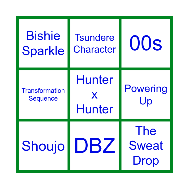 This bingo card has 9 words: Shoujo, 00s, Tsundere Character, Transformation Sequence, Bishie Sparkle, Powering Up, Hunter x Hunter, The Sweat Drop and DBZ.