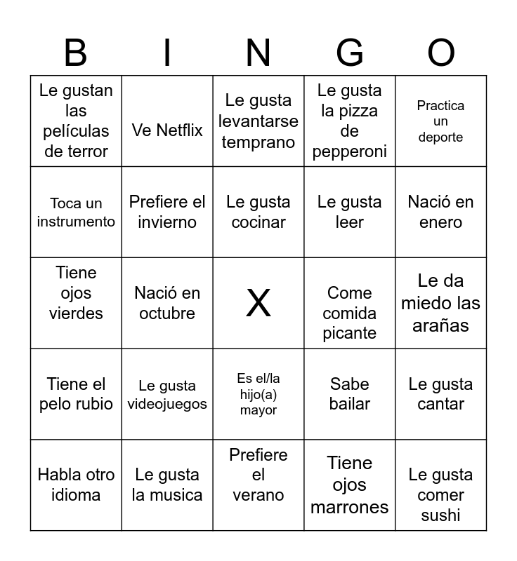 This bingo card has a free space and 24 words: Le gusta videojuegos, Le gusta la musica, Le gusta cocinar, Habla otro idioma, Practica un deporte, Le gustan las películas de terror, Toca un instrumento, Ve Netflix, Come comida picante, Es el/la hijo(a) mayor, Le gusta leer, Tiene ojos vierdes, Sabe bailar, Le gusta cantar, Prefiere el invierno, Tiene ojos marrones, Le da miedo las arañas, Le gusta levantarse temprano, Nació en enero, Nació en octubre, Le gusta comer sushi, Tiene el pelo rubio, Le gusta la pizza de pepperoni and Prefiere el verano.