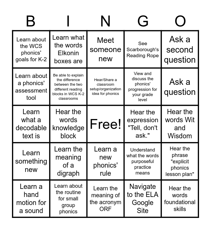 This bingo card has a free space and 24 words: Learn the meaning of a digraph, Learn about the routine for small group phonics, Hear/Share a classroom setup/organization idea for phonics, Learn a hand motion for a sound, Ask a second question, Learn about the WCS phonics' goals for K-2, Learn about a phonics' assessment tool, Learn what the words Elkonin boxes are, Hear the expression "Tell, don't ask.", Learn a new phonics' rule, View and discuss the phonics' progression for your grade level, Learn what a decodable text is, Understand what the words purposeful practice means, Hear the phrase "explicit phonics lesson plan", Be able to explain the difference between the two different reading blocks in WCS K-2 classrooms, Navigate to the ELA Google Site, Hear the words Wit and Wisdom, Meet someone new, Ask a question, Hear the words knowledge block, Hear the words foundational skills, Learn something new, See Scarborough's Reading Rope and Learn the meaning of the acronym ORF.