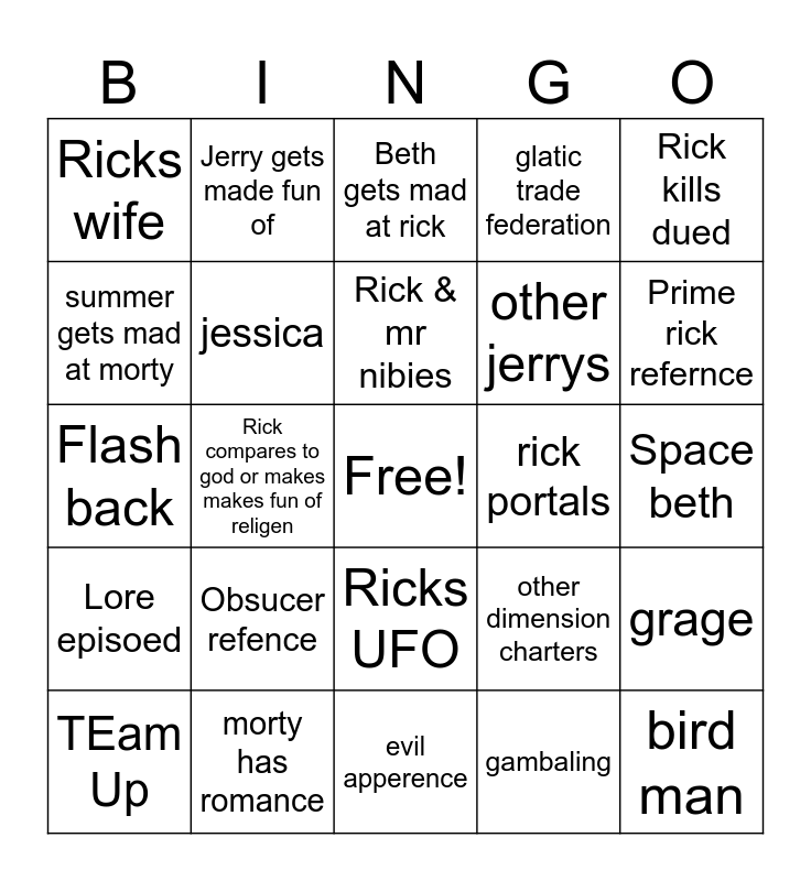 This bingo card has a free space and 24 words: Obsucer refence, morty has romance, Rick & mr nibies, TEam Up, Rick kills dued, Ricks wife, summer gets mad at morty, Jerry gets made fun of, rick portals, Ricks UFO, other jerrys, Flash back, other dimension charters, grage, jessica, gambaling, Space beth, Beth gets mad at rick, Prime rick refernce, Rick compares to god or makes makes fun of religen, bird man, Lore episoed, glatic trade federation and evil apperence.