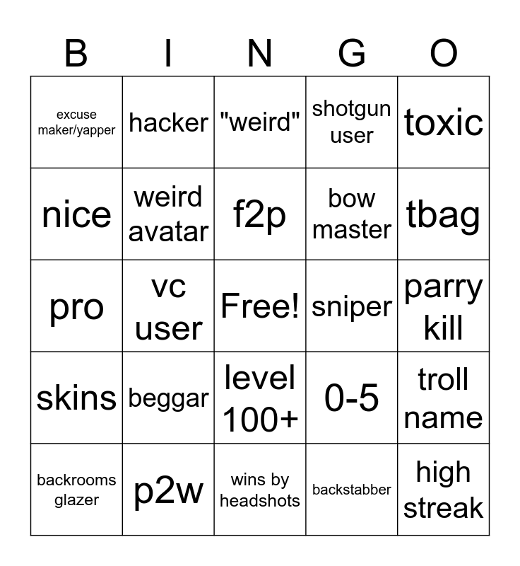 This bingo card has a free space and 24 words: beggar, p2w, f2p, backrooms glazer, toxic, excuse maker/yapper, nice, hacker, sniper, level 100+, bow master, pro, 0-5, troll name, weird avatar, backstabber, parry kill, "weird", tbag, vc user, high streak, skins, shotgun user and wins by headshots.