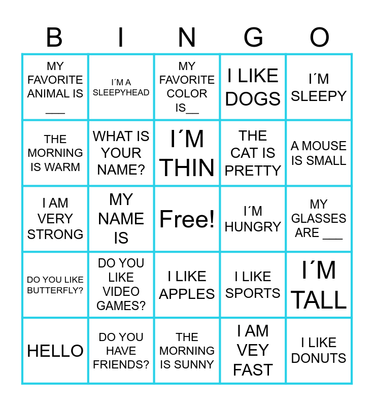 This bingo card has a free space and 29 words: HELLO, HOW ARE YOU, MY NAME IS, I AM __YEARS OLD, MY FAVORITE ANIMAL IS ___, MY FAVORITE COLOR IS__, WHAT IS YOUR NAME?, DO YOU LIKE VIDEO GAMES?, I´M HUNGRY, DO YOU HAVE FRIENDS?, MY GLASSES ARE ___, I LIKE DONUTS, THE MORNING IS SUNNY, I AM VEY FAST, A MOUSE IS SMALL, MY GRANDFATHER IS OLD, I LIKE APPLES, DO YOU LIKE BUTTERFLY?, I´M SLEEPY, I AM VERY STRONG, I LIKE SPORTS, THAT TABLE IS SHORT, THE CAT IS PRETTY, THE MORNING IS WARM, I LIKE DOGS, I´M A SLEEPYHEAD, I´M TALL, I´M THIN and I AM VERY GOOD.