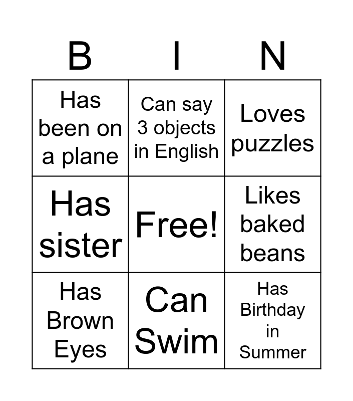 This bingo card has a free space and 11 words: Has Pet, Can Swim, Has Birthday in Summer, Has Brown Eyes, Can say 3 objects in English, Loves puzzles, Likes baked beans, Likes to sing, Has sister, Has been on a plane and Loves books.