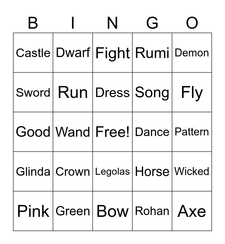 This bingo card has a free space and 54 words: Elphaba, Glinda, Aragorn, Arwen, Legolas, Gimli, Rumi, Jinu, Sword, Magic, Castle, Gold, Green, Pink, Lilac, Bow, Axe, Song, Gem, Pattern, Horse, Monkey, Dance, Demon, Elf, Dwarf, Oz, Rivendell, Gondor, Rohan, Arrow, King, Queen, Royal, Fight, Evil, Good, Wicked, Braid, Run, Hide, Spin, Throne, Wild, Crown, Potion, Hello, Fan, Dress, Wand, Fly, Wings, Charm and Up.