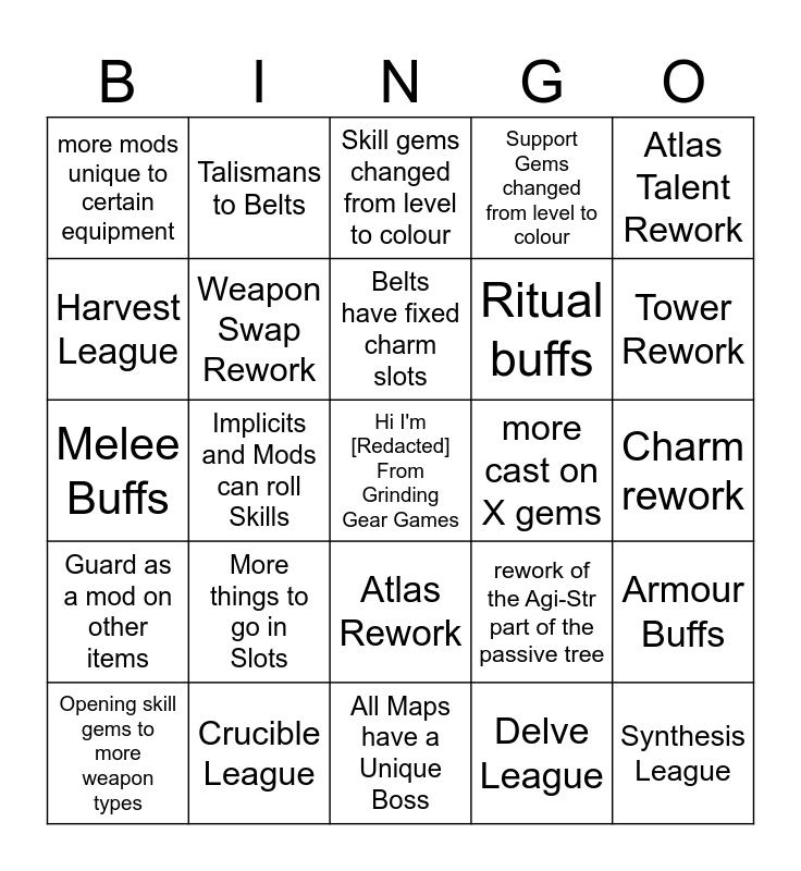 This bingo card has a free space and 24 words: More things to go in Slots, Crucible League, Belts have fixed charm slots, Opening skill gems to more weapon types, Atlas Talent Rework, more mods unique to certain equipment, Harvest League, Talismans to Belts, more cast on X gems, Atlas Rework, Ritual buffs, Melee Buffs, rework of the Agi-Str part of the passive tree, Armour Buffs, Weapon Swap Rework, Delve League, Charm rework, Skill gems changed from level to colour, Tower Rework, Implicits and Mods can roll Skills, Synthesis League, Guard as a mod on other items, Support Gems changed from level to colour and All Maps have a Unique Boss.