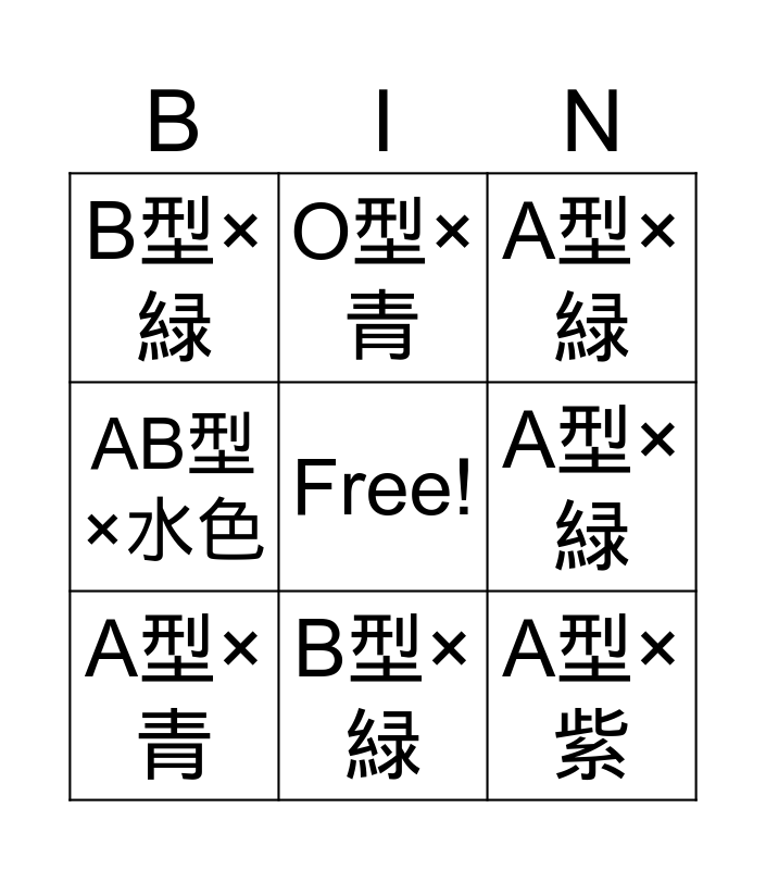 This bingo card has a free space and 88 words: O型×青, B型×青, A型×青, A型×青, O型×青, B型×青, B型×黄色, O型×緑, B型×紫, O型×青, B型×水色, B型×水色, B型×緑, A型×青, A型×オレンジ, B型×緑, O型×黄色, AB型×赤, O型×黄色, AB型×青, O型×オレンジ, O型×黄色, A型×青, A型×水色, A型×水色, AB型×オレンジ, O型×青, A型×赤, O型×黄色, O型×黄色, A型×緑, AB型×水色, B型×オレンジ, B型×黄色, O型×青, A型×緑, B型×緑, A型×緑, O型×水色, AB型×青, A型×赤, O型×緑, O型×紫, O型×緑, A型×赤, A型×緑, B型×黄色, AB型×オレンジ, B型×オレンジ, B型×水色, A型×水色, O型×赤, O型×黄色, A型×青, A型×赤, AB型×緑, AB型×緑, O型×青, A型×緑, A型×緑, O型×オレンジ, A型×青, O型×青, O型×青, O型×赤, A型×緑, O型×赤, A型×青, A型×緑, B型×青, B型×オレンジ, A型×水色, B型×オレンジ, A型×紫, A型×水色, B型×青, A型×水色, A型×オレンジ, O型×オレンジ, B型×青, B型×水色, A型×赤, A型×青, B型×青, O型×水色, O型×水色, B型×水色 and A型×青.