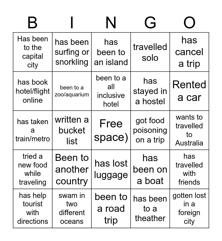 This bingo card has a free space and 24 words: Been to another country, swam in two different oceans, been to a all inclusive hotel, has help tourist with directions, has cancel a trip, Has been to the capital city, has book hotel/flight online, has been surfing or snorkling, got food poisoning on a trip, has lost luggage, has stayed in a hostel, has taken a train/metro, has been on a boat, has travelled with friends, been to a zoo/aquarium, has been to a theather, wants to travelled to Australia, has been to an island, Rented a car, written a bucket list, gotten lost in a foreign city, tried a new food while traveling, travelled solo and been to a road trip.
