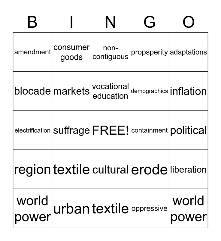 This bingo card has a free space and 24 words: textile, urban, vocational education, world power, adaptations, amendment, blocade, consumer goods, containment, cultural, demographics, electrification, erode, liberation, markets, oppressive, political, non-contiguous, inflation, suffrage, world power, region, propsperity and textile.