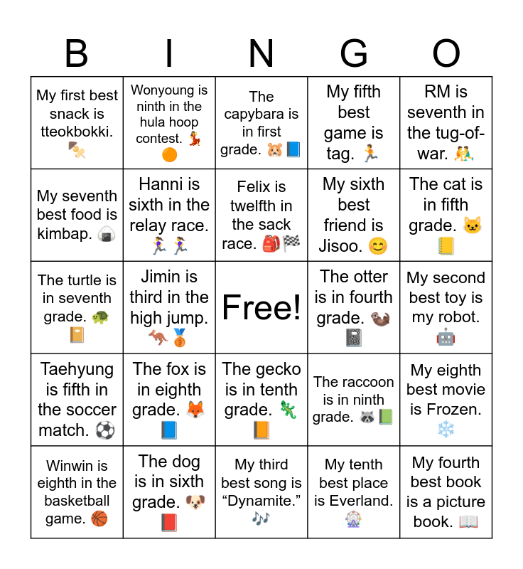This bingo card has a free space and 33 words: Jungkook is first in the 100-meter race. πββοΈπ₯, Jennie is second in the swimming contest. πββοΈπ₯, Jimin is third in the high jump. π¦π₯, Karina is fourth in the long jump. πββοΈπͺ, Taehyung is fifth in the soccer match. β½, Hanni is sixth in the relay race. πββοΈπββοΈ, RM is seventh in the tug-of-war. π€ΌββοΈ, Winwin is eighth in the basketball game. π, Wonyoung is ninth in the hula hoop contest. ππ , Lisa is tenth in the skipping rope race. πͺ’, Felix is twelfth in the sack race. ππ, The capybara is in first grade. πΉπ, The penguin is in second grade. π§π, The poodle is in third grade. π©π, The otter is in fourth grade. π¦¦π, The cat is in fifth grade. π±π, The dog is in sixth grade. πΆπ, The turtle is in seventh grade. π’π, The fox is in eighth grade. π¦π, The raccoon is in ninth grade. π¦π, The gecko is in tenth grade. π¦π, The bear is in twelfth grade. π»π, My first best snack is tteokbokki. π’, My second best toy is my robot. π€, My third best song is βDynamite.β πΆ, My fourth best book is a picture book. π, My fifth best game is tag. π, My sixth best friend is Jisoo. π, My seventh best food is kimbap. π, My eighth best movie is Frozen. βοΈ, My ninth best animal is the bunny. π°, My tenth best place is Everland. π‘ and My twelfth best gift is a puzzle. π§©.
