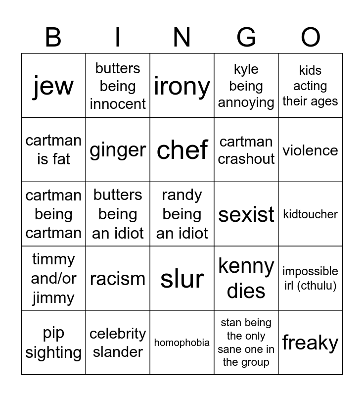 This bingo card has 25 words: racism, homophobia, chef, pip sighting, kids acting their ages, jew, cartman is fat, butters being innocent, sexist, slur, cartman crashout, cartman being cartman, kenny dies, impossible irl (cthulu), ginger, freaky, kidtoucher, irony, violence, butters being an idiot, randy being an idiot, celebrity slander, timmy and/or jimmy, kyle being annoying and stan being the only sane one in the group.