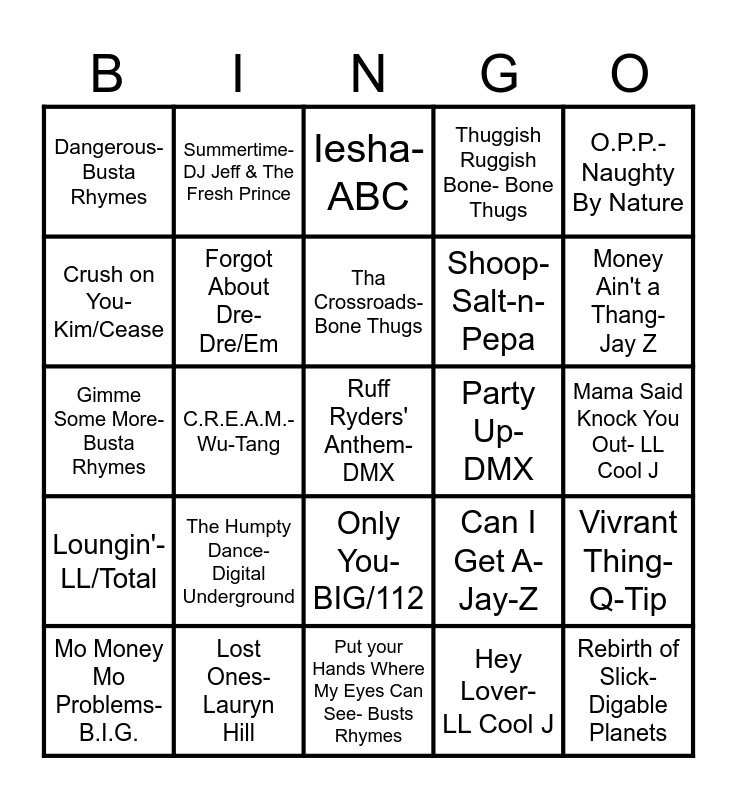 This bingo card has 64 words: How do you want it- 2Pac, People Everyday- Arrested Development, I Got 5 On It- Luniz, Vivrant Thing- Q-Tip, Hip Hop Hooray- Naughty By Nature, Funkdafied- Da Brat, Summertime- DJ Jeff & The Fresh Prince, 1st of the Month- Bone Thugs, Tha Crossroads- Bone Thugs, No Scrubs- TLC, Only You- BIG/112, Rump Shaker- Wreckx-n-Effect, Mama Said Knock You Out- LL Cool J, O.P.P.- Naughty By Nature, Killing Me Softly- Fugees, Crush on You- Kim/Cease, C.R.E.A.M.- Wu-Tang, Dangerous- Busta Rhymes, You Can Do It- Ice Cube, Shoop- Salt-n-Pepa, The Humpty Dance- Digital Underground, Loungin'- LL/Total, Thuggish Ruggish Bone- Bone Thugs, I Get Around- Digital Underground, Ready or Not- Fugees, California Love - 2Pac, It Was a Good Day - Ice Cube, Gin and Juice - Snoop, Regulate- Warren G/ Nate Dogg, Keep Their Heads Ringin'- Dr. Dre, Big Pimpin'- Jay Z, Big Poppa- B.I.G., You Got Me- The Roots/Erykah Badu, Still Not a Player- Big Pun, Money Ain't a Thang- Jay Z, Mo Money Mo Problems- B.I.G., Still Dre- Dre/Snoop, Hey Lover- LL Cool J, Insane in the Membrane- Cypress Hill, Forgot About Dre- Dre/Em, Gimme Some More- Busta Rhymes, Party Up- DMX, It's All About the Benjamins- Diddy/B.I.G., Nuthin but a GThang, Hypnotize- B.I.G., Ruff Ryders' Anthem- DMX, Lost Ones- Lauryn Hill, Rebirth of Slick- Digable Planets, Can I Get A- Jay-Z, 2 of Amerikaz Most Wanted- Pac/Snoop, U.N.I.T.Y.- Queen Latifah, Rosa Parks- Outkast, Put your Hands Where My Eyes Can See- Busts Rhymes, One More Chance/Stay w/Me- B.I.G., Get Money- Junior MAFIA, Ain't Gonna- Hurt Nobody, Iesha- ABC, I Got a Man- Positive K, Playground- ABC, Jump- Kris Koss, Is it Good to You- Heavy D, Nuttin But Love- Heavy D, Back That Azz Up- Juvenile and Tootsie Roll- 69 Boyz.